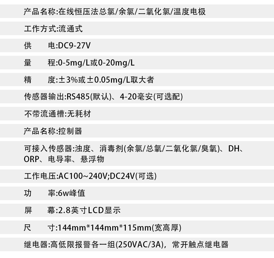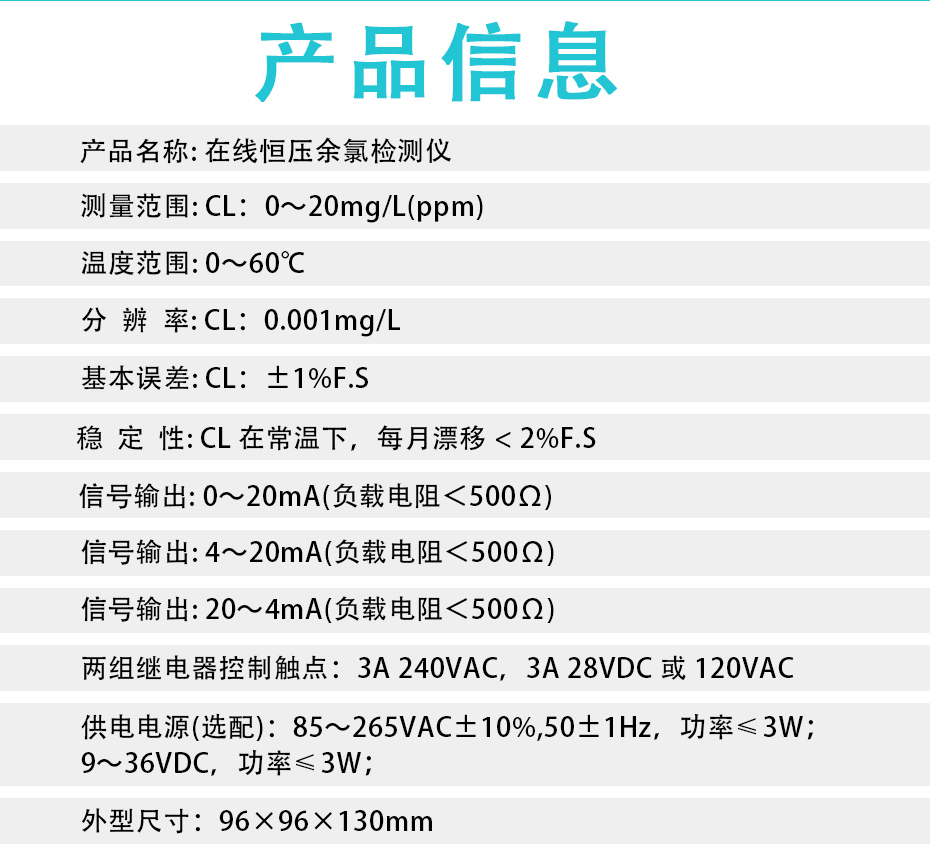 水質余氯在線測控儀,即水質在線余氯計,是采用非膜式恒電壓傳感器,無須更換膜片與藥劑,靈敏度高,信號響應迅速,測量準確、性能穩定、維護簡單。該水中余氯測控系統具有使用方便、準確度高、經濟的特點。運用這一系列的分析技術,確保儀器長期工作的穩定可靠性和準確性。具有中文菜單式操作、485通訊等功能。